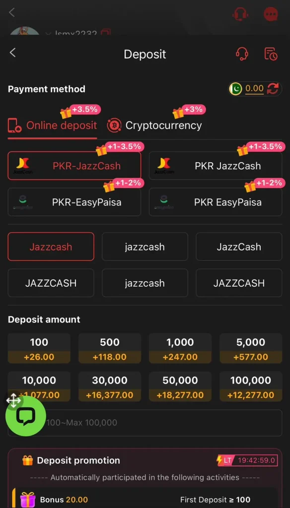 - Choose your deposit method (JazzCash, EasyPaisa, or bank option)